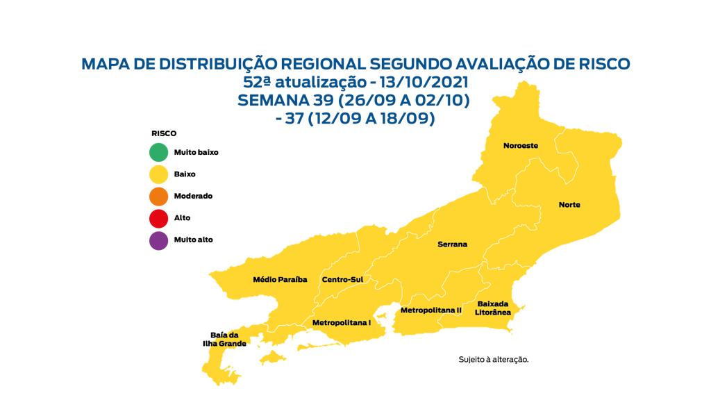 Com a melhora do cenário epidemiológico, todos os municípios do Rio apresentam pela primeira vez um risco baixo para a Covid-19. Segundo os dados do 52º Mapa de Risco do estado, divulgado nesta sexta (15), o panorama é o melhor observado desde 8 de julho de 2020, quando o levantamento foi lançado.