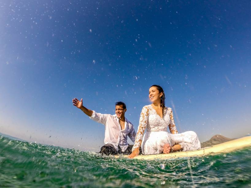 A ideia que surgiu nos EUA não é nova, mas está fazendo sucesso entre as cariocas. O conceito é tirar fotos vestida de noiva após o casamento, com os noivos mais relaxados e espontâneos. A expressão não precisa ser levada ao pé da letra, mas entrar no mar com a roupa não poderia ficar de fora em uma cidade como o Rio. “Os lugares mais pedidos são as praias de Niterói, Barra e Grumari. Se o vestido for alugado, as fotos são feitas antes da viagem. Mas se for comprado, pode ser feito na volta da lua de mel”, conta o fotógrafo Giovani Garcia, acrescentando que todas as noivas que fazem o casamento com ele, acabam aderindo ao pacote extra. A lua de mel, inclusive, é um ótimo lugar para fazer essa sessão de fotos, já que de uma forma geral, os destinos escolhidos oferecem belíssimas paisagens. O profissional estuda as locações e a movimentação do sol para marcar os horários, geralmente são necessários de dois a três dias. Mas a brincadeira não sai barata: pacotes no estado do Rio começam em R$2.500 para quem já fizer a cerimônia também (se não, sobe para R$4 mil). Para levar o fotógrafo na lua de mel, é preciso pagar todas as despesas e mais o cachê, que parte de R$3 mil.