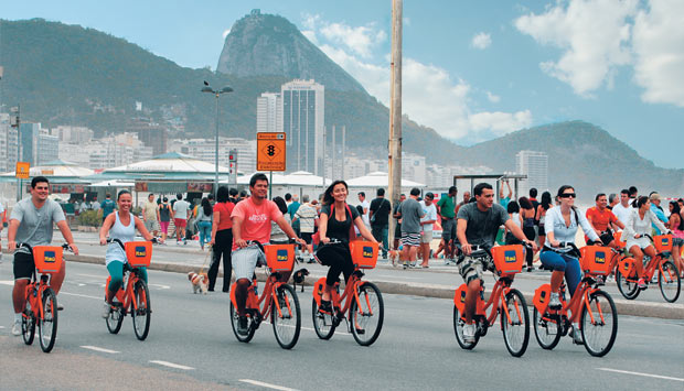 Hoje os maiores exemplos funcionam nas cidades chinesas de Wuhan e Hangzhou, com 70?000 e 65?600 bicicletas em cada uma. De acordo com dados do site Bike-Sharing World Map, a retirada nesses lugares acontece a cada dois segundos nos horários de pico. Logo em seguida está o parisiense Vélib?, o mais conhecido deles, com 23?900. Calcado no modelo francês, o objetivo do Bike Rio é servir como meio de transporte alternativo, oferecendo o passe diário, a 5 reais, e o mensal, a 10. Seus administradores acreditam que a expansão do projeto, com previsão de mais oito pontos de locação até o fim de março, ajudará a redistribuir melhor os usuários e a sanar as principais falhas. Tomara. Afinal de contas, as laranjinhas têm tudo para ser incorporadas de vez à rotina dos cariocas.