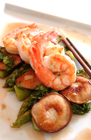 Misture bem todos os ingredientes do molho. Reserve. Coloque os aspargos no vapor por cerca de quatro minutos e depois acrescente os camarões. Deixe mais quatro minutos. Aqueça um fio de azeite em uma frigideira. Acrescente os aspargos, os camarões e o shitake. Acrescente sal e pimenta. Reserve. Salteie as folhas de mostarda, rapidamente, no azeite. Disponha a mostarda no centro de um prato retangular branco, coloque por cima os aspargos paralelos uns aos outros e, por cima, os camarões. Ao redor, coloque os shitakes. Finalize com o molho em volta da montagem e com os talos de ciboulette sobre os camarões.