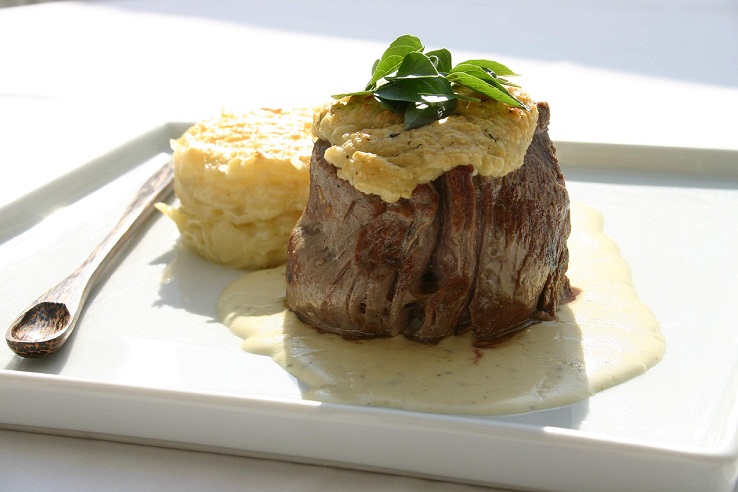 Filet mignon com crosta de parmesão, molho blue cheese e gateau de batata Rendimento: 6 porções (220 g cada)