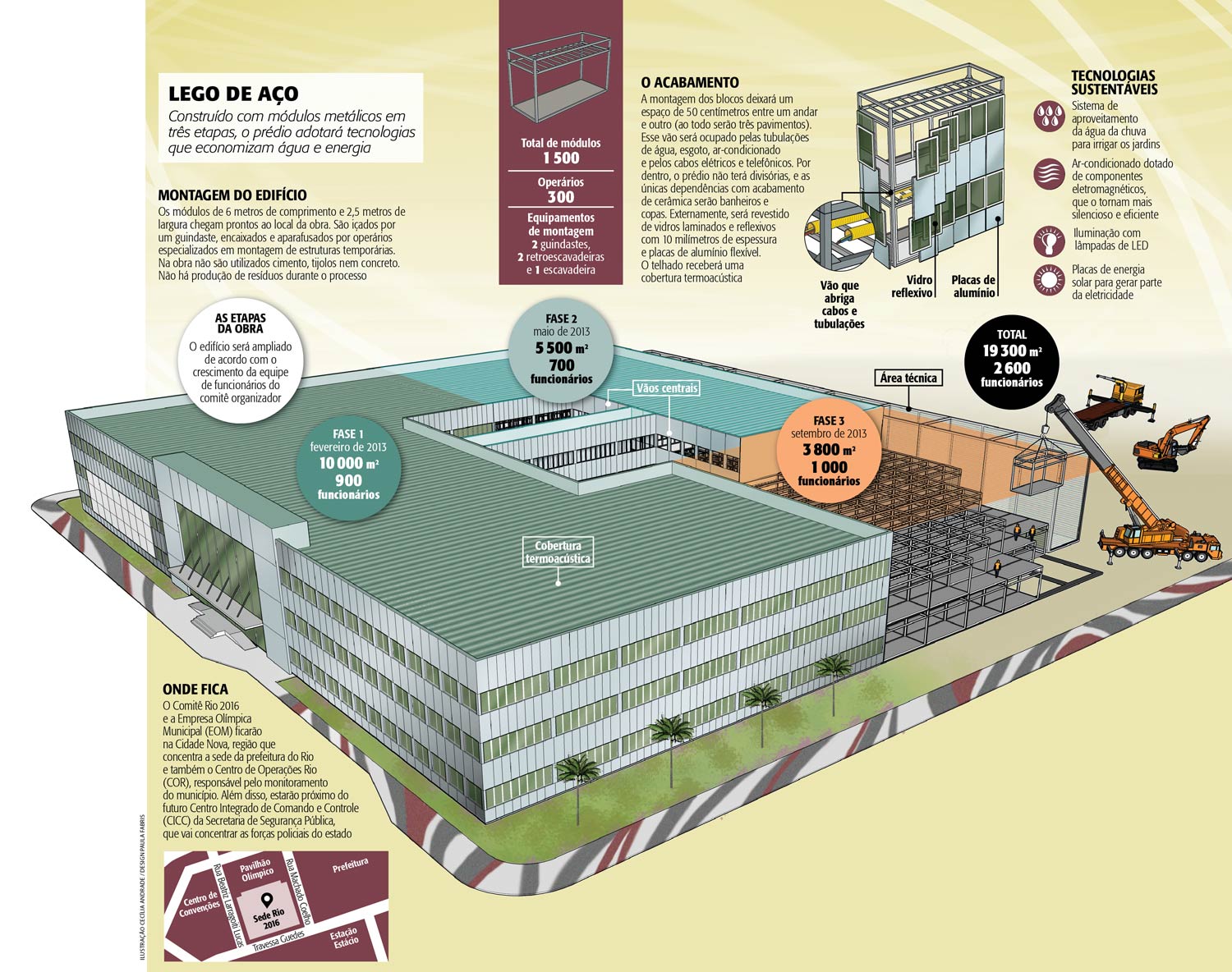 Quem costuma passar pela região entre a Praça da Bandeira e o centro da cidade certamente já reparou na edificação que está sendo erguida ao lado da prefeitura do Rio. Ela se destaca devido a uma série de particularidades. O barulho provocado é mínimo, pois não há britadeiras nem bate-estacas em ação, algo raro nesse tipo de empreendimento, que costuma ser uma amolação para a vizinhança. Um olhar mais atento perceberá também que o novo imóvel prescinde de concreto ou alvenaria. Ele é todo feito de estruturas de aço pré-moldadas, que já chegam prontas para ser montadas no local, num mecanismo similar ao do Lego, brinquedo que consiste em pequenos blocos de plástico encaixáveis. Dessa maneira, sem maiores estardalhaços, ganha forma a sede do Comitê Organizador Rio 2016, que será o centro nevrálgico da Olimpíada carioca. Esse autêntico quartel-general é o lugar onde serão tomadas as decisões mais importantes tanto no período de preparação dos Jogos como no decorrer da competição. Projetado com três andares, o prédio será erigido em três etapas. A primeira delas está prevista para terminar em fevereiro, quando ele terá capacidade para acolher inicialmente até 900 pessoas. As demais serão sacramentadas em maio e setembro do próximo ano (veja a ilustração), habilitando-o a receber novas levas de funcionários e colaboradores da entidade. No fim de todo o processo, o novo caixotão da Cidade Nova terá quase 20?000 metros quadrados de área, formada pelo encaixe de 150?000 blocos de 6 metros de comprimento por 2,5 metros de largura cada um. No auge de seu funcionamento, a expectativa é que ele abrigue 2?600 profissionais de diversos setores. “No momento estamos separados em dois endereços na Barra. Seria inviável executar uma missão de tamanha complexidade sem total integração entre as equipes”, afirma Leonardo Gryner, diretor-geral do comitê.