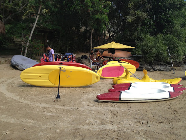 Caiaques e pranchas de stand up paddle estão espalhados pela praia para aluguel.