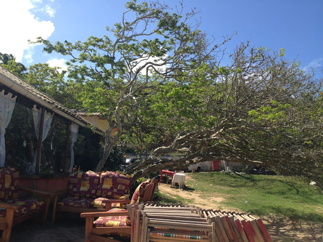 Vegetação abundante e pedras enfeitam a ponta da praia.