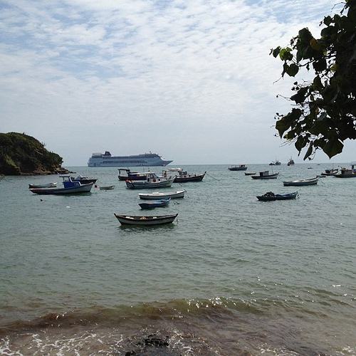 O transatlântico passa ao largo, contrastando com a silhueta dos barquinhos dos pescadores.