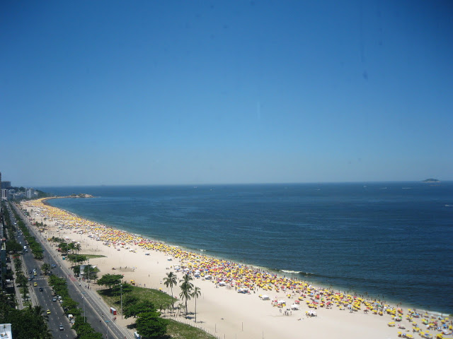 Ipanema vista da janela do hotel. A praia se estende sem acidentes até o Arpoador, lá no fundo (na foto, pois é de lá que ela parte, na realidade). No final dos anos 60 e início dos 70, por obra do Pasquim, primeiro, e depois dos doces bárbaros, que a tomaram de assalto, Ipanema se tornou a praia mais badalada do Rio e do Brasil. E, pelas notas de Vinícius e Jobim, conhecida no mundo todo. Mas até então não havia páreo para Copacabana. Do final dos 50 até a primeira metade dos 60, Copa era tudo. Tia Cacilda morava no primeiro andar de um prédio do Posto Três, próximo à Constante Ramos. Os perigos eram tantos que eu, entrado na chamada terceira infância, cruzava, sem as mãos de adulto, a Avenida Atlântica, então de pista única (anterior ao aterro) e pisava na areia da Princesinha do Mar para tomar uma acossa das ondas pesadas e caçar tatuí (comestíveis, cozidos no arroz), hoje praticamente desaparecidos do lugar. Nunca houve tatuís tão grandes como aqueles. Quando a onda me arrastava, eu procurava as pernas de um adulto para me ancorar. À tarde, o programa preferido era me sentar num dos bancos de concreto que enfeitavam a orla para assistir às peladas ou aos jogos do campeonato de futebol. O futebol de areia do Rio, terreno do lendário Neném Prancha, foi sempre muito badalado, motivo de bravas discussões nos bares. Foi um celeiro de craques, como o lateral Júnior, do Flamengo. Quando não havia jogo, outro prazer era tomar um lanche na Colombo, ali na esquina da Nossa Senhora de Copacabana com Barão de Ipanema, vizinha ao prédio onde morava a tia Glorinha. No cair da tarde, nada melhor do que ser arrastado pela prima Celina, de belas e longas pernas bronzeadas, para uma roda de violão no Arpoador. A Bossa Nova estava no auge e eu sofria por não ter dez anos a mais.