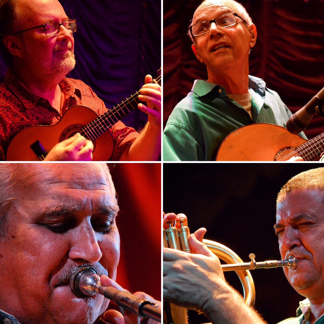 No sentido horário: Cazes, no alto, à direita, Joel Nascimento, Zé da Velha e Silvério Pontes, alguns dos retratados na exposição Os Chorões no Rio Scenarium