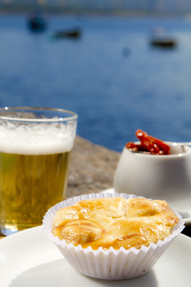 Bar Urca. Na mureta, o quitute fica mais saboroso com a vista. Entre os sabores há frango, siri e carne-seca (R$ 6,50).