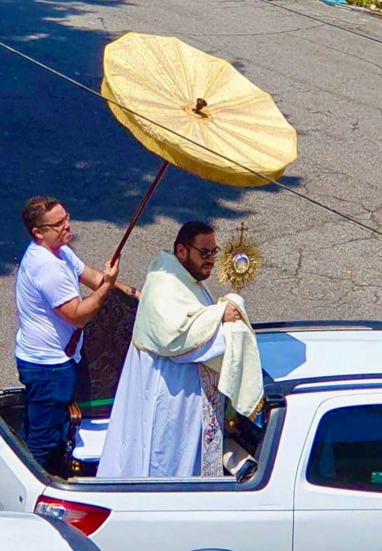 Já que as igrejas estão fechadas por conta do isolamento social imposto pelo Governo do Estado para conter a pandemia do novo coronavírus, o padre Alexandre Tarquino, da paróquia de Inhaúma, Zona Norte, resolveu fazer uma “procissão-solo” pelas ruas de Inhaúma, Zona Norte do Rio, levando a palavra de Deus a quem seguia o confinamento voluntário. Na manhã do último domingo (29), o pároco subiu na carroceria de uma caminhonete e, apesar do calor que fazia no Rio, abençoou o bairro ostentando a representação do Santíssimo Sacramento.