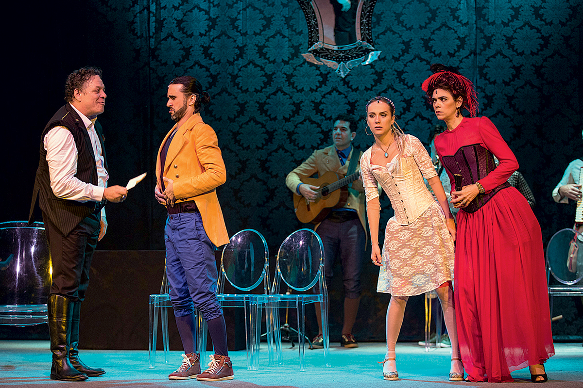 Os méritos desta deliciosa comédia (e eles são muitos) começam pela ideia: montar pela primeira vez no Brasil o texto do francês Pierre-Augustin Caron de Beaumarchais na forma de um musical, com canções inspiradas na famosa ópera baseada na peça, composta por Mozart sobre o libreto de Lorenzo da Ponte. Na história, Fígaro (Leandro Castilho) e Suzana (Carol Garcia), criados do conde e da condessa de Almaviva (Ernani Moraes e Solange Badim, respectivamente), estão prestes a se casar. O que seria uma ocasião feliz é, na verdade, motivo de preocupação para o noivo. Afinal, o patrão pretende fazer valer seu “direito de pernada”, que lhe garante uma primeira noite com as empregadas antes do marido. As confusões que se desenrolam a partir daí são prato cheio para uma hilariante sátira aos modos tão fúteis quanto arrogantes das elites — originalmente a nobreza da França do século XVIII, mas aplicáveis a qualquer lugar e tempo. A direção de Daniel Herz investe com gosto no clima de farsa, garantindo excelente ritmo à montagem, de modo que suas duas horas passam voando. Além de encarnar o protagonista, Castilho é autor da ótima trilha sonora (indicada aos prêmios Shell e Cesagranrio), executada ao vivo por todo o elenco, revestindo de tintas brasileiras a obra de Mozart. Admiravelmente entrosado, o elenco brilha em conjunto e também individualmente, aí incluídos os coadjuvantes. No quarteto principal, Castilho é figura catalisadora em cena, encontrando no carisma de Moraes um belo antagonista, enquanto Solange entrega atuação refinada e Carol, jovem surpresa, mostra formidável dote vocal e timing cômico (120min). 12 anos. Estreou em 22/11/2014.